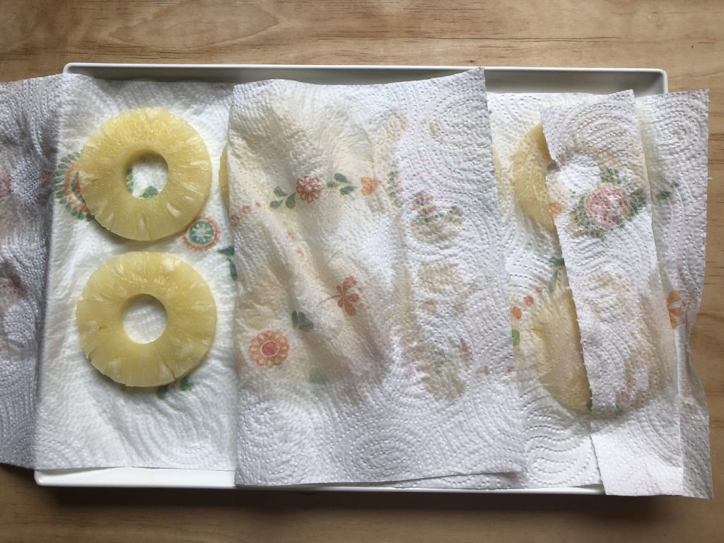 • Escorra as fatias de abacaxi da calda em que estão conservadas e seque-as bem, pressionando com papel toalha. Não descarte essa calda, pois precisaremos de 100 ml na massa do bolo.