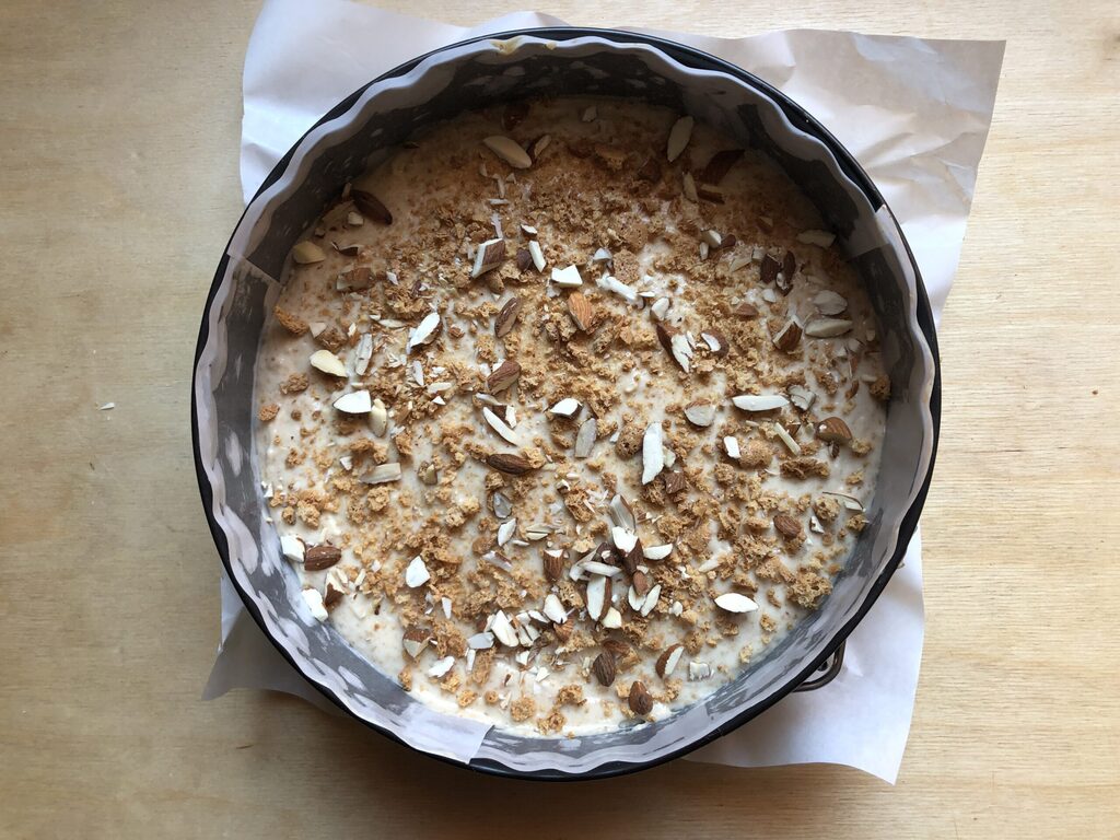 Imagino que vocês estejam se perguntando por que eu a chamei de bolo leve sem preocupações. Agora eu explico. Trata-se de um doce pouco doce, simples, rústico e genuíno para degustar sem muitos sentimentos de culpa. Na massa há a farinha tipo 1, menos refinada que a clássica 00 e, portanto, mais rica em fibras e nutrientes. A doçura é realmente moderada: apenas 40 g de açúcar mascavo, equilibrado pelo sabor aromático dos amaretti e pelo toque delicado do coco ralado. Não contém ovos nem manteiga, mas apenas leite e óleo que tornam a massa macia e leve. E em cima… uma chuva de amaretti esfarelados e amêndoas cortadas com faca cria uma crosta crocante e irresistível. Mas o “sem preocupações” também se refere ao fato de que seu preparo é super fácil porque é só bater tudo, colocar na forma e levar ao forno. Enfim, um doce ideal para o café da manhã ou lanche e perfeito para quem busca receitas mais saudáveis sem abrir mão do sabor. Encontrei essa receita no livro de Marco Bianchi “Il Gusto della Felicità” e fiquei imediatamente curiosa. Não podia deixar de experimentar e aqui eu a proponho com algumas pequenas modificações. Minha cozinha termina aqui, mas a sua começa agora: acenda o forno e me conte como ficou!