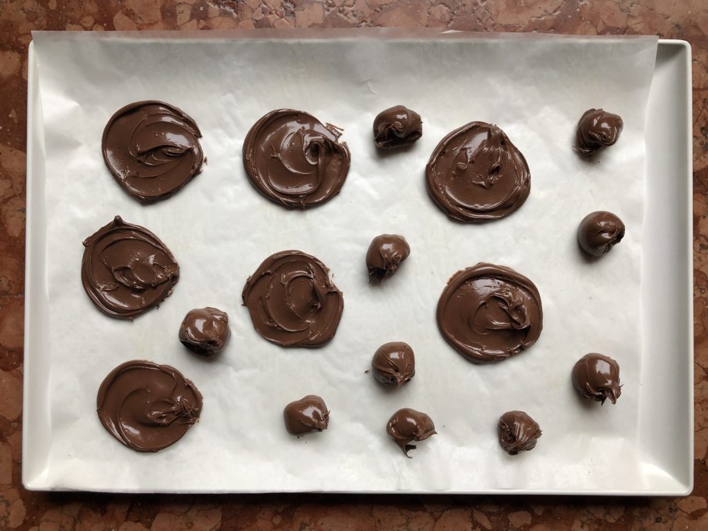 Em uma bandeja forrada com papel manteiga, faça bolinhas e discos com a Nutella, depois coloque-os no freezer por algumas horas ou até que estejam completamente solidificados. Eu os coloquei no dia anterior. Como disse na minha apresentação, ajuste a quantidade de creme de acordo com o seu gosto pessoal.