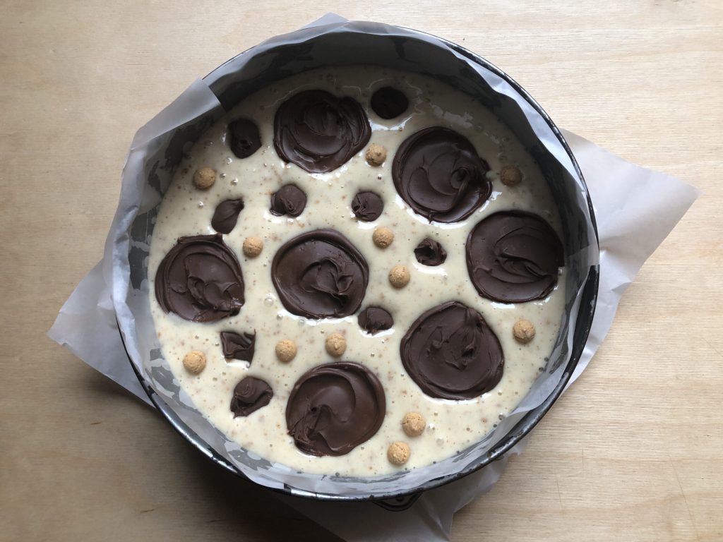 Coloque sobre a massa os discos e as bolinhas de Nutella recém-retirados do freezer: as bolinhas afundarão no forno enquanto os discos, mais leves, ficarão na superfície. Distribua aqui e ali também alguns amaretti pequenos. Se não os tiver, adicione migalhas de amaretto.