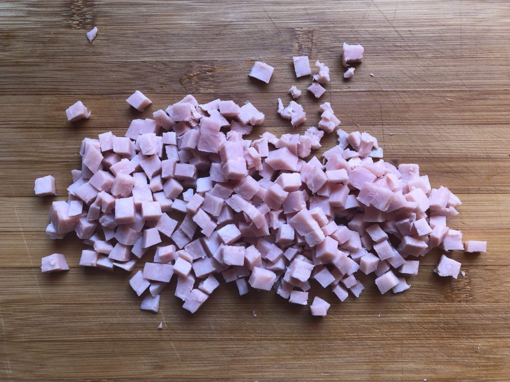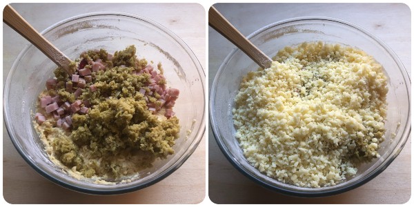 • Quando a farinha estiver perfeitamente incorporada à massa, adicione o presunto em cubos, as azeitonas e o emmental picados e o queijo ralado.