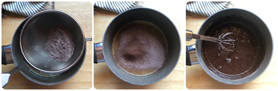 Em seguida, adicione-os na panela peneirando-os através de uma peneira de malhas finas. Incorpore-os perfeitamente sempre com o batedor.