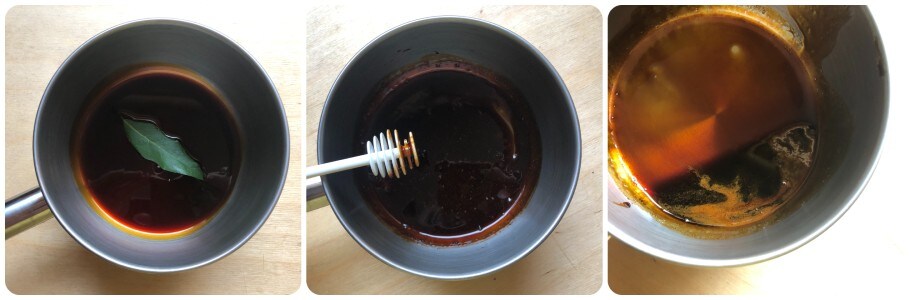 Pouco antes de as cebolas ficarem prontas, coloque em uma panela pequena duas colheres de vinagre balsâmico e uma folha de louro. Leve ao fogo e aqueça. Em seguida, retire a folha de louro, adicione duas colheres de mel líquido e misture bem.