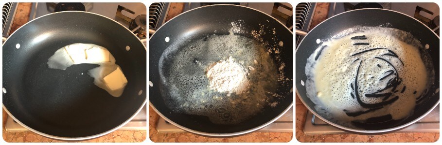 Derreta a manteiga em uma panela, depois adicione a farinha de uma vez e misture rapidamente para integrar os ingredientes até formar um creminho.