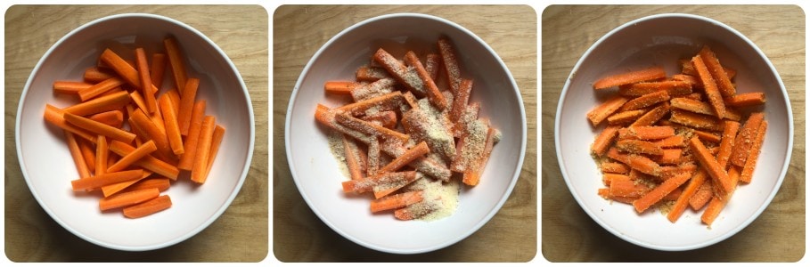 Raspar as cenouras, lavá-las, secá-las com papel toalha e cortá-las em palitos.