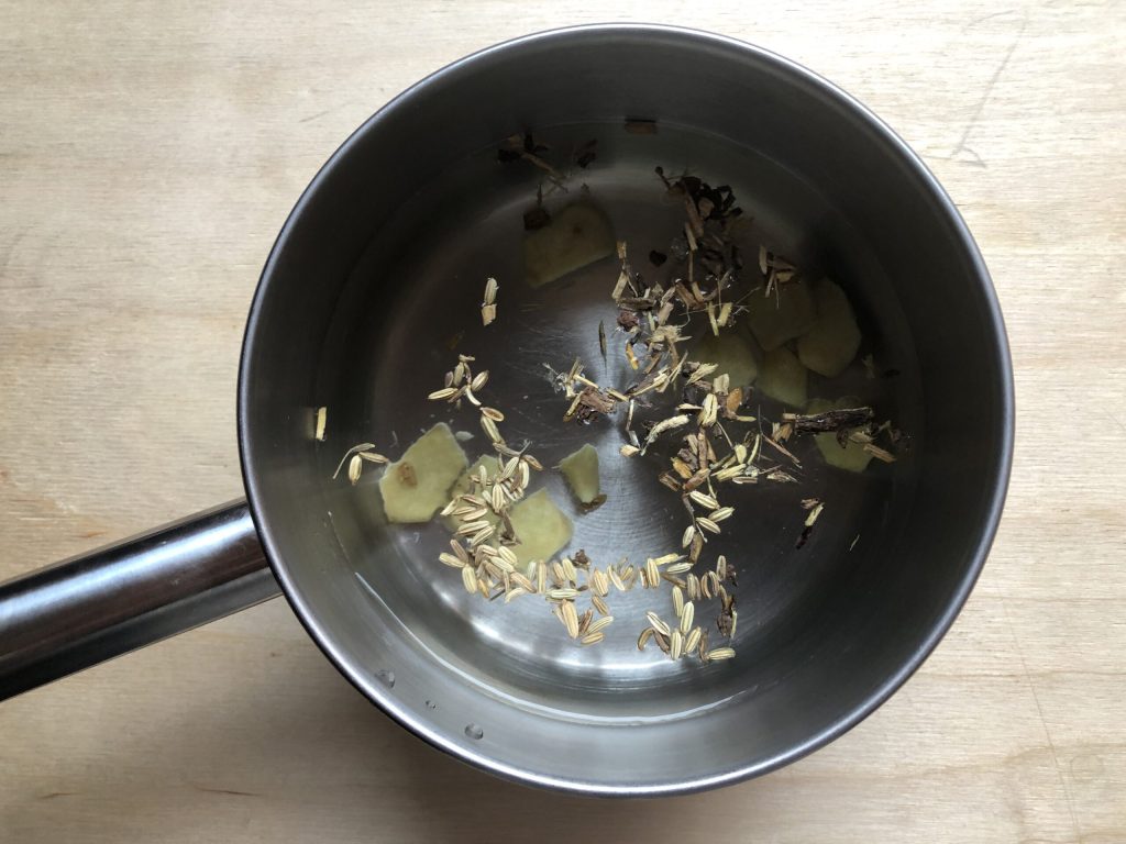 Em uma panela, coloque (a frio) a água junto com o gengibre, as sementes de funcho e os pedaços de raiz de alcaçuz.