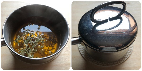 Depois deste tempo, desligue o fogo e adicione a melissa e a camomila.