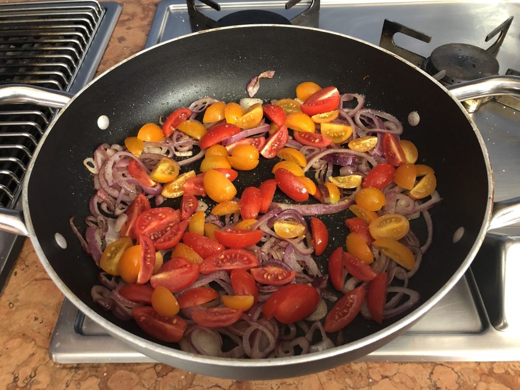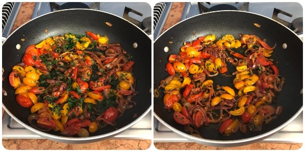 Em seguida, adicione os tomatinhos, tempere com sal e pimenta a gosto e continue a cozinhar por mais cinco minutos, mexendo frequentemente.