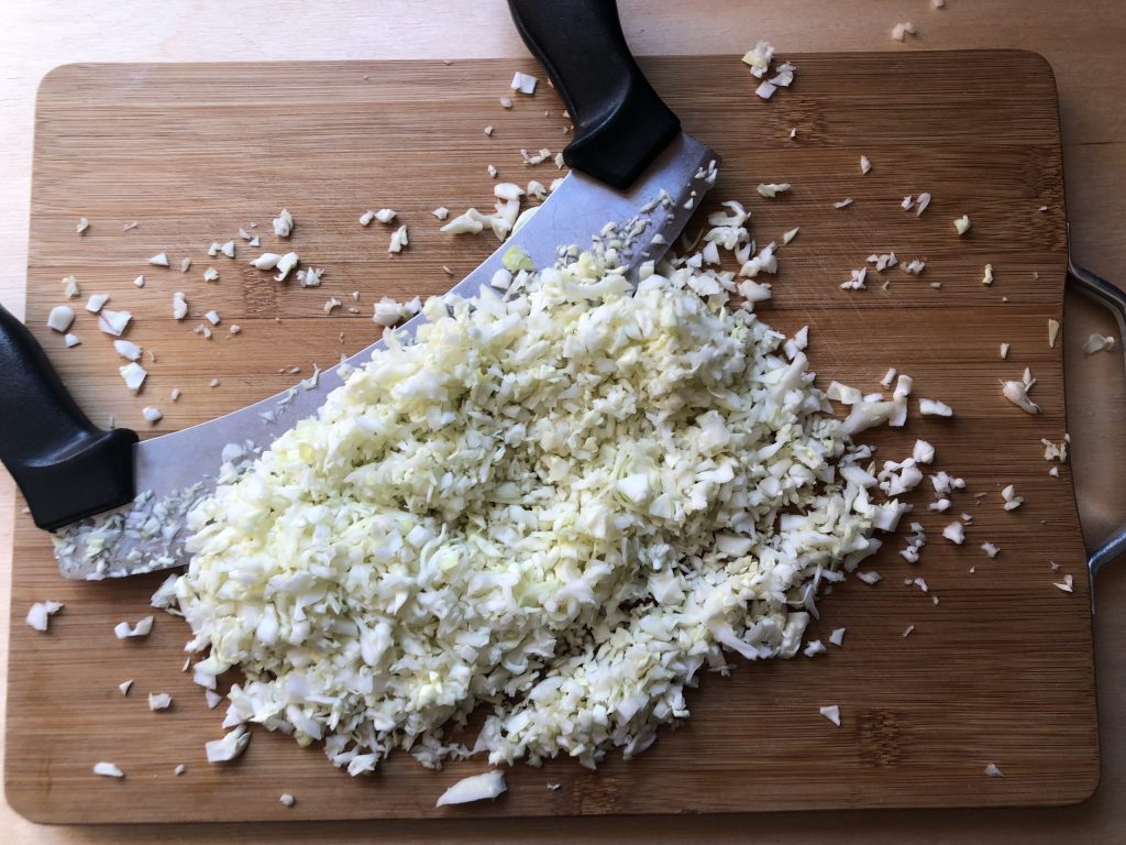 Lave bem o repolho, seque-o com papel toalha e pique finamente com uma mezzaluna.