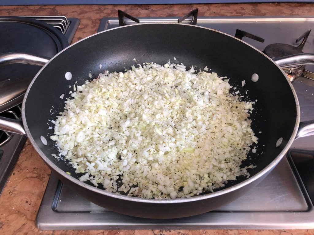 Deixe-a dourar por alguns instantes, depois adicione o repolho, duas boas pitadas de sal e uma generosa pitada de pimenta preta moída e cozinhe por 6/7 minutos, mexendo de vez em quando.