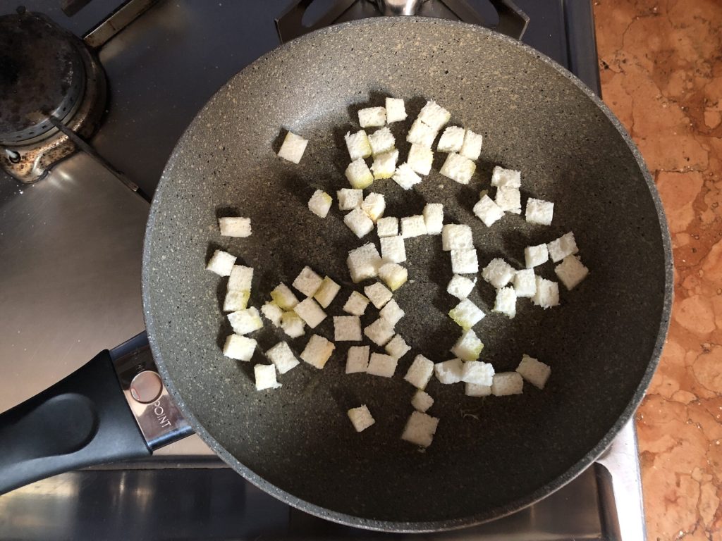 Enquanto isso, corte as fatias de pão de forma em cubinhos e toste-os numa frigideira com um fio de azeite até ficarem dourados e crocantes.