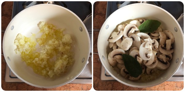 Em uma panela, aqueça algumas colheres de sopa de azeite antes de juntar a cebola. Deixe refogar por alguns instantes e depois acrescente os cogumelos e as folhas de sálvia.