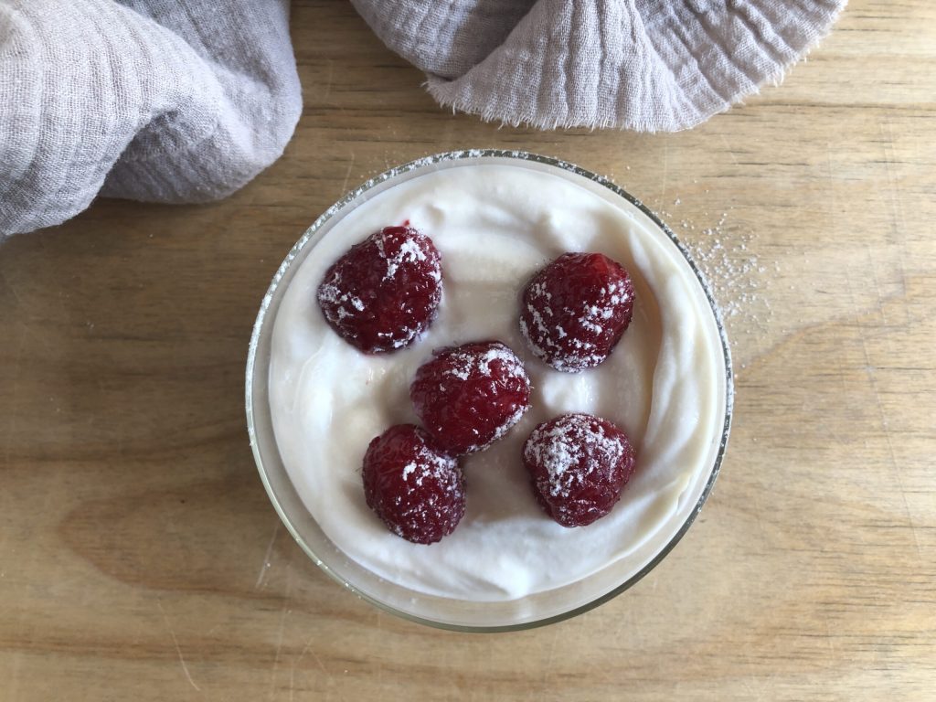 Se você está procurando uma sobremesa de colher fácil de preparar, mas capaz de surpreender, esta creme de ricota com framboesas é a escolha certa. Não requer nenhum cozimento e fica pronta em poucos minutos. Uma sobremesa que conquista desde a primeira colherada com sua consistência aveludada, o sabor delicado do creme e a doçura levemente ácida das framboesas frescas. Enfim… uma sobremesa perfeita para encerrar um jantar com beleza ou para se mimar em um momento especial. Você pode servi-la em tacinhas individuais, como eu fiz, ou em uma única taça da qual cada um se serve. Uma pitada de açúcar de confeiteiro e está pronta.