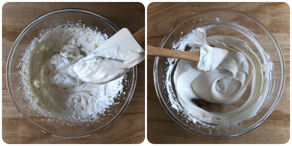 Depois, adicione o creme de leite batido à mistura de ricota e incorpore delicadamente com movimentos de baixo para cima para evitar desmontar o creme.