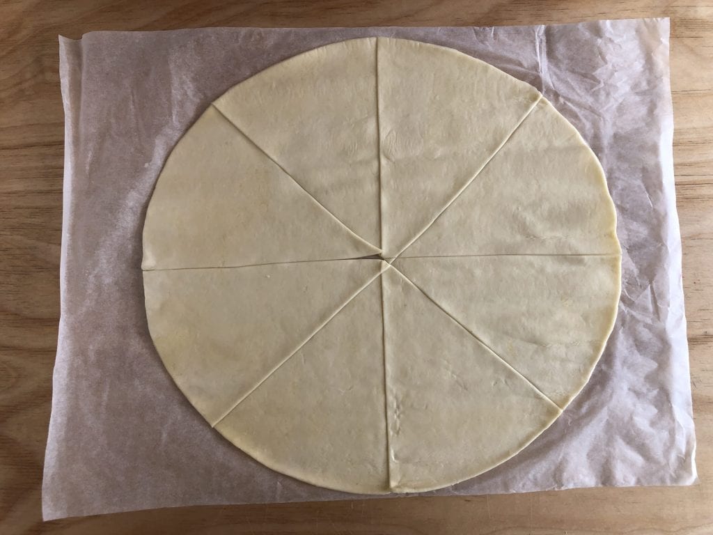 Estender o rolo de massa folhada e dividi-lo em oito triângulos (eu usei um cortador de pizza).