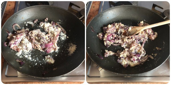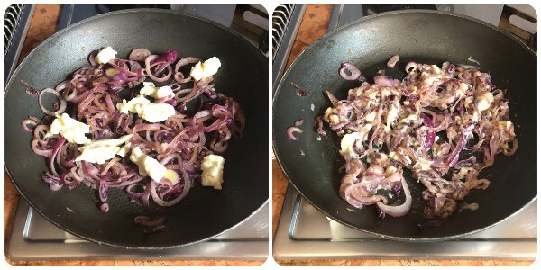 Uma vez prontas, desligar o fogo, retirar a folha de louro, adicionar o taleggio em pedacinhos e misturar bem com as cebolas.