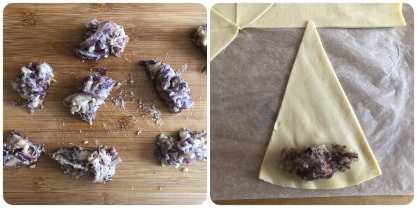 Transferir o recheio de cebola para uma tábua e dividi-lo em oito partes iguais, em seguida, colocar o recheio na base de cada triângulo.