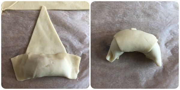 Dobrar a massa folhada sobre o recheio tentando selar bem as bordas, depois enrolar o triângulo e curvar as extremidades para baixo para dar a forma clássica de croissant.
