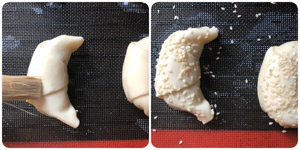 Por fim, pincelar os croissants com leite e polvilhar com sementes de gergelim.