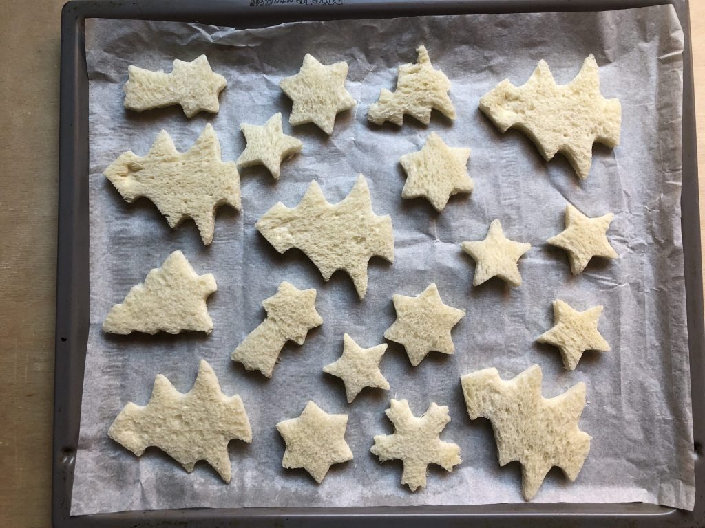 Cortar as fatias de pão para sanduíche usando cortadores de biscoito com tema natalino. Para reduzir ao máximo as sobras, use estrelinhas de vários tamanhos, mesmo as pequenas são ótimas.