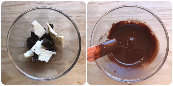 • Corte o chocolate em pedaços, coloque-o em uma pequena tigela junto com a manteiga (também em pedaços) e derreta tudo em banho-maria ou no micro-ondas. Se escolher esta segunda opção, como fiz eu, proceda em etapas de 20 segundos, mexendo sempre o composto até obter um creme brilhante e homogêneo. Uma vez derretido, deixe esfriar um pouco.