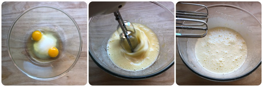 • Coloque os ovos em outra tigela junto com o açúcar e bata bem com o batedor elétrico até que o composto fique fofo e claro.