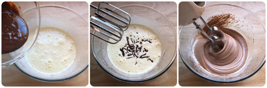 • Então, adicione o chocolate derretido e já morno e continue trabalhando com o batedor elétrico.