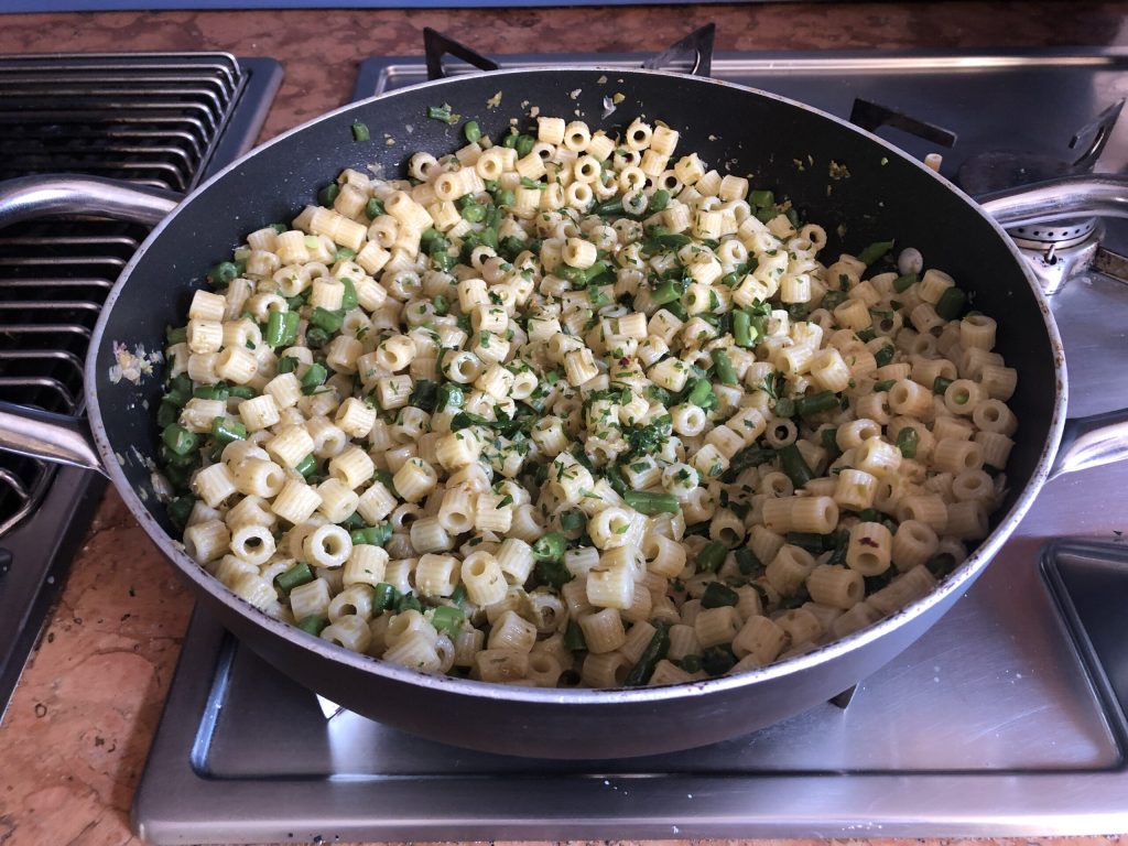 Enquanto isso, em uma panela, leve bastante água salgada para ferver. Quando estiver fervendo, adicione os ditaloni junto com as vagens.
