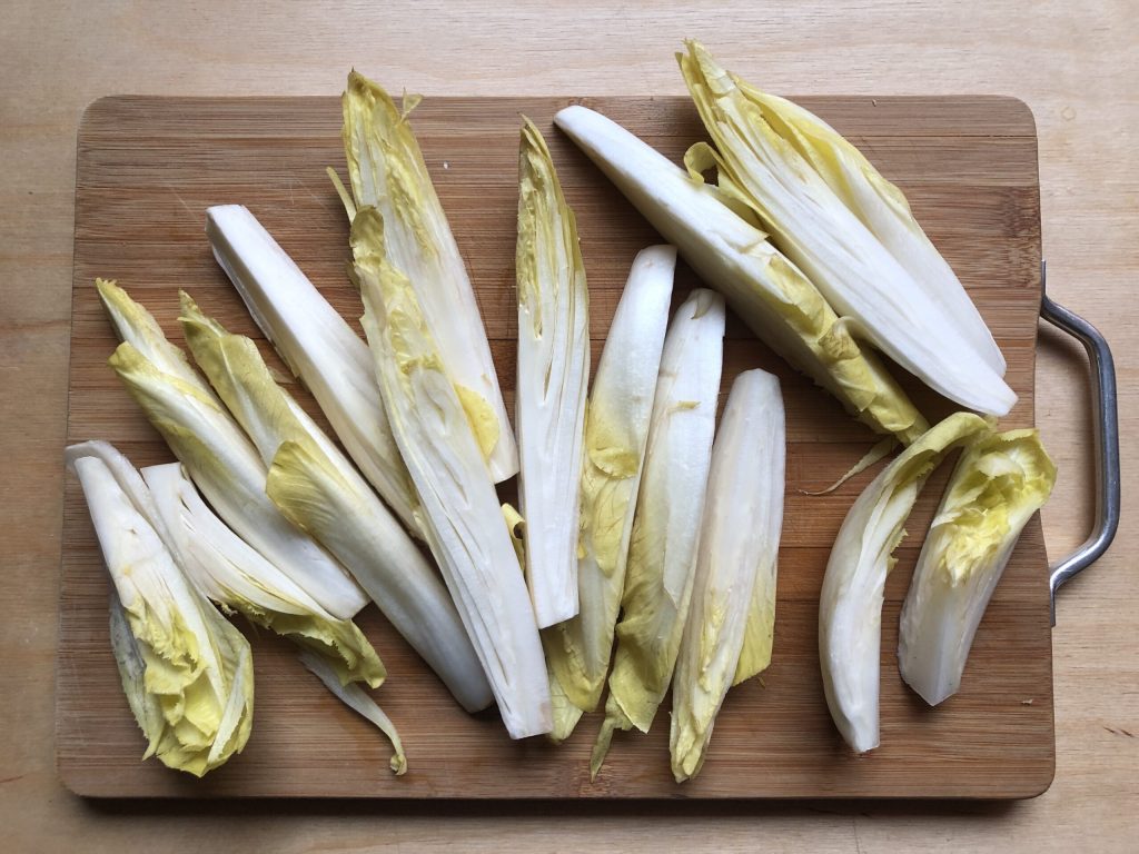 Lave as cabeças de endívia e seque bem, pressionando com papel-toalha. Em seguida, remova a base mais dura e corte as cabeças maiores em quartos e as menores ao meio.