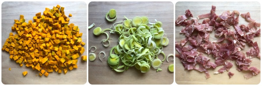 Adicione a água do cozimento reservada e perfume com uma moída de pimenta preta. Finalmente, adicione também as tiras de presunto cru e misture bem.