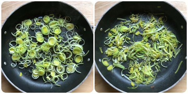 Coloque os alho-porós na mesma frigideira, salgue, adicione um pouco de água e doure até que fiquem macios (aproximadamente 3/4 minutos).