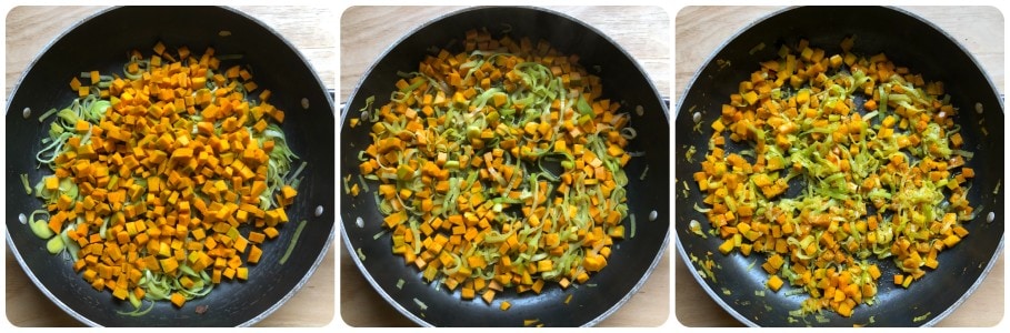 Em seguida, adicione os cubos de abóbora e continue cozinhando por mais 10/12 minutos, mexendo frequentemente e adicionando um pouco de água se o condimento secar muito. No final do cozimento, desligue o fogo, ajuste o sal e a pimenta e regue com um fio de azeite cru.