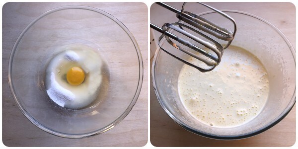 Em uma tigela, coloque o açúcar e o ovo e bata-os com uma batedeira até obter uma mistura clara e espumosa.