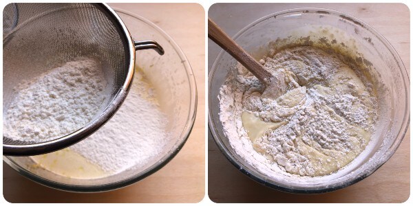 Neste ponto, adicione gradualmente os ingredientes secos peneirando-os através de uma peneira de malha fina e incorpore-os delicadamente à mistura com uma espátula.