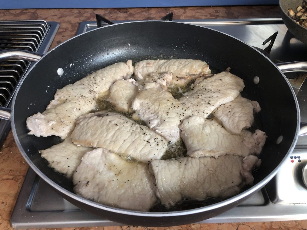 Deixe evaporar, depois adicione os cogumelos, uma concha abundante de caldo quente (mais, se necessário) e continue o cozimento em fogo médio-baixo por cerca de dez minutos, virando as fatias de carne de vez em quando.