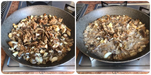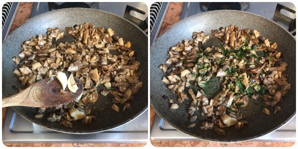 Em uma frigideira, aqueça um par de colheres de sopa de azeite com um dente de alho descascado e cortado ao meio. Adicione os cogumelos, uma pitada de sal, uma pitada de pimenta-do-reino e cozinhe por 6/7 minutos até que sua água seja quase completamente absorvida.