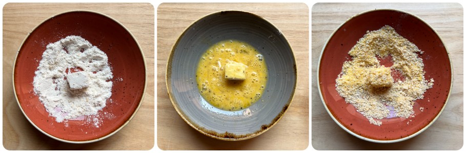 • Agora passe cada cubinho de feta primeiro na farinha, depois no ovo e por fim na mistura de farinha de rosca e fubá. Pressione bem para que a empanagem grude. Se quiser uma casquinha ainda mais grossa, pode fazer dupla empanagem: passe novamente no ovo e depois na farinha de rosca/fubá. Eu não fiz dupla e achei perfeito assim.