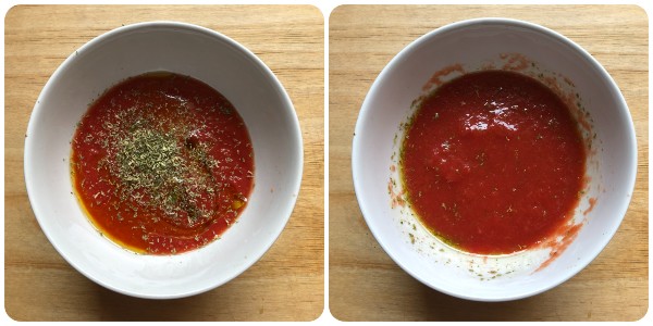 Em uma tigelinha, misture a polpa de tomate com uma colher de azeite, uma generosa pitada de sal e uma boa pitada de orégano. Reserve.