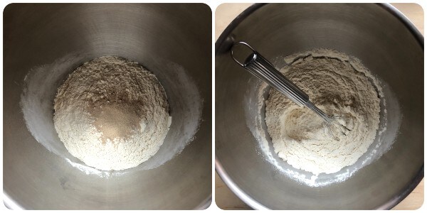 Despeje a farinha na tigela, adicione o fermento seco e misture com um pequeno batedor manual.