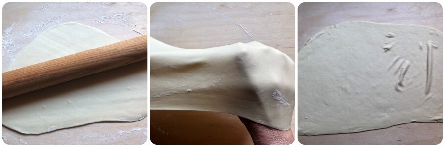 Abra com o rolo a primeira metade na bancada ligeiramente enfarinhada. Depois levante a massa e estique com os nós dos dedos para não rasgá-la. Estique delicadamente até ficar bem fina.