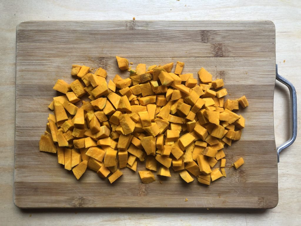 Limpe a abóbora retirando a casca, as sementes e todos os filamentos internos. Lave-a em água corrente e seque muito bem, secando com papel-toalha ou com um pano de prato limpo. Em seguida, corte-a em pedaços pequenos.