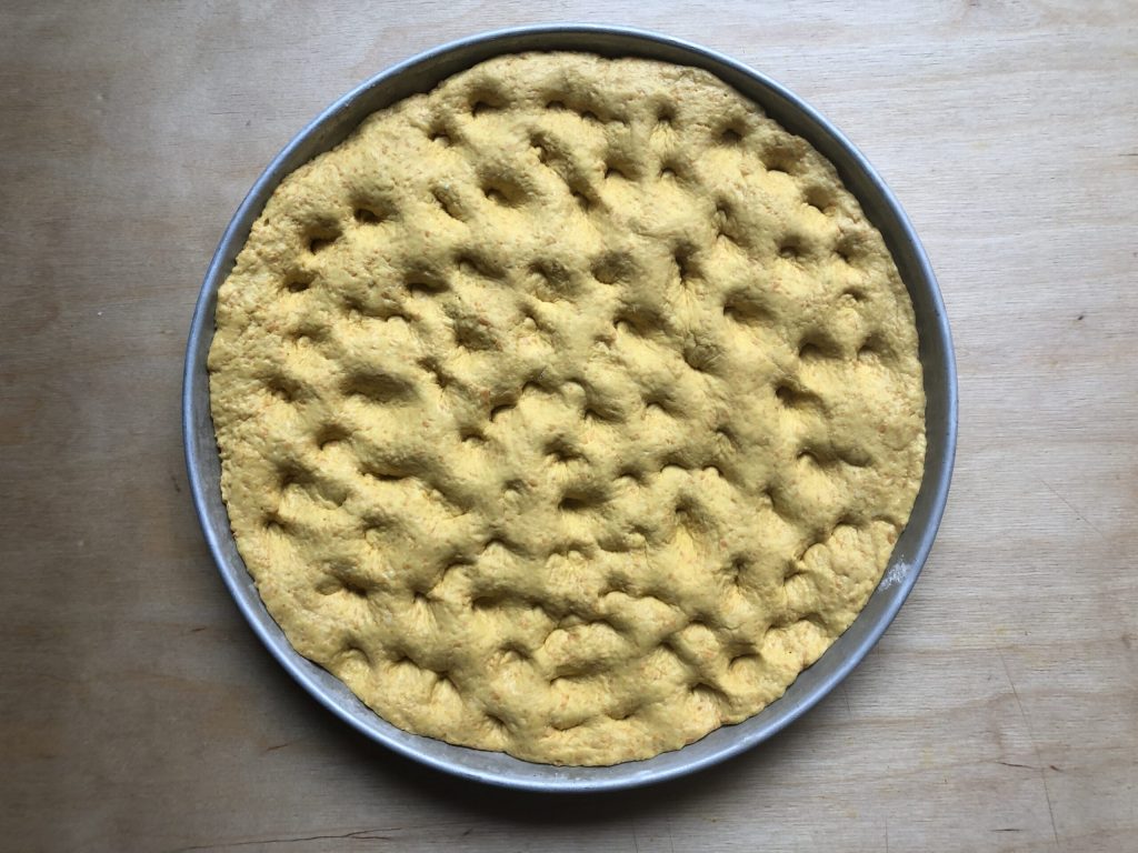 Transfira para uma assadeira untada com 30 cm de diâmetro e estenda a massa. Eu forrei o fundo da assadeira com papel manteiga e depois pincelei levemente com azeite também as bordas. Por fim, com a ponta dos dedos, faça as clássicas covinhas típicas da focaccia.