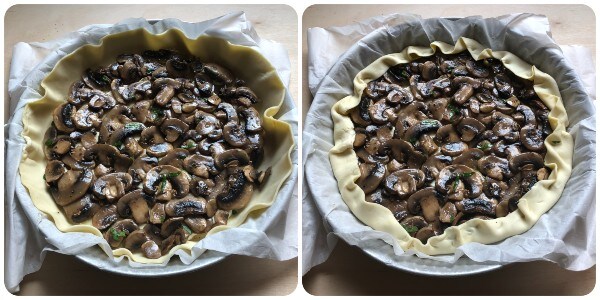 • Neste ponto, distribua sobre toda a superfície os cogumelos já mornos e dobre a borda da massa folhada sobre o recheio.