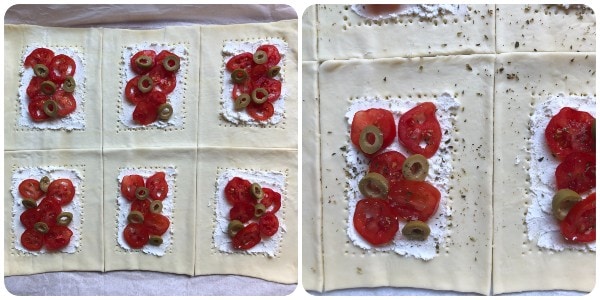 • Distribuir sobre o creme as fatias de tomate e de azeitonas; salgar levemente e polvilhar com um pouco de orégano seco.