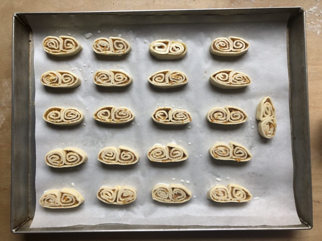 Envolver o rolo obtido em papel manteiga e transferi-lo para o freezer por 15/20 minutos. Esta etapa é muito importante porque nos permitirá cortar os folhados com muito mais facilidade. Você também pode prepará-los com bastante antecedência: enrole a massa folhada, embrulhe bem e congele. No momento do uso, basta deixar amolecer 5/10 minutos fora do freezer para facilitar o corte, depois proceder normalmente.