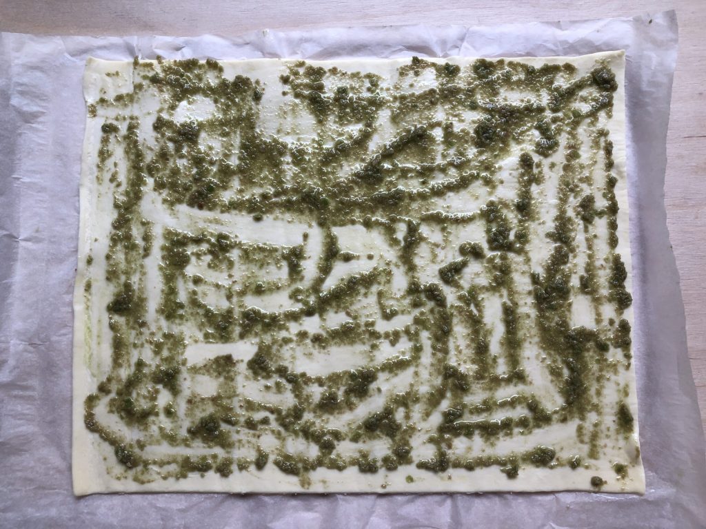 Desenrole o retângulo de massa folhada mantendo-o sobre o papel manteiga fornecido na embalagem e pincele com patê de azeitonas verdes (ou pretas).