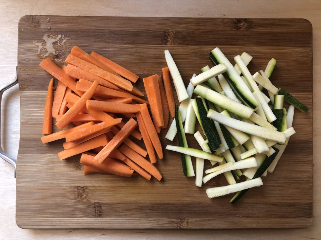 Enquanto isso, prepare as cenouras e as abobrinhas. Lave-as, seque com papel toalha e corte-as em palitos.