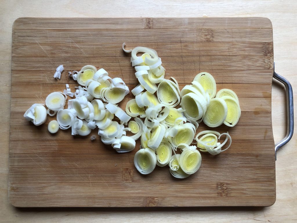 Limpe o alho-poró, removendo a parte verde mais escura, a camada exterior e todas as raízes. Lave bem em água corrente e corte em rodelas.