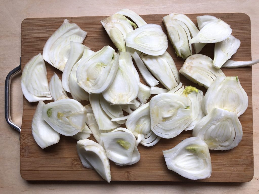 Em seguida, lave o funcho em água corrente, seque-o com papel toalha e corte-o em fatias.