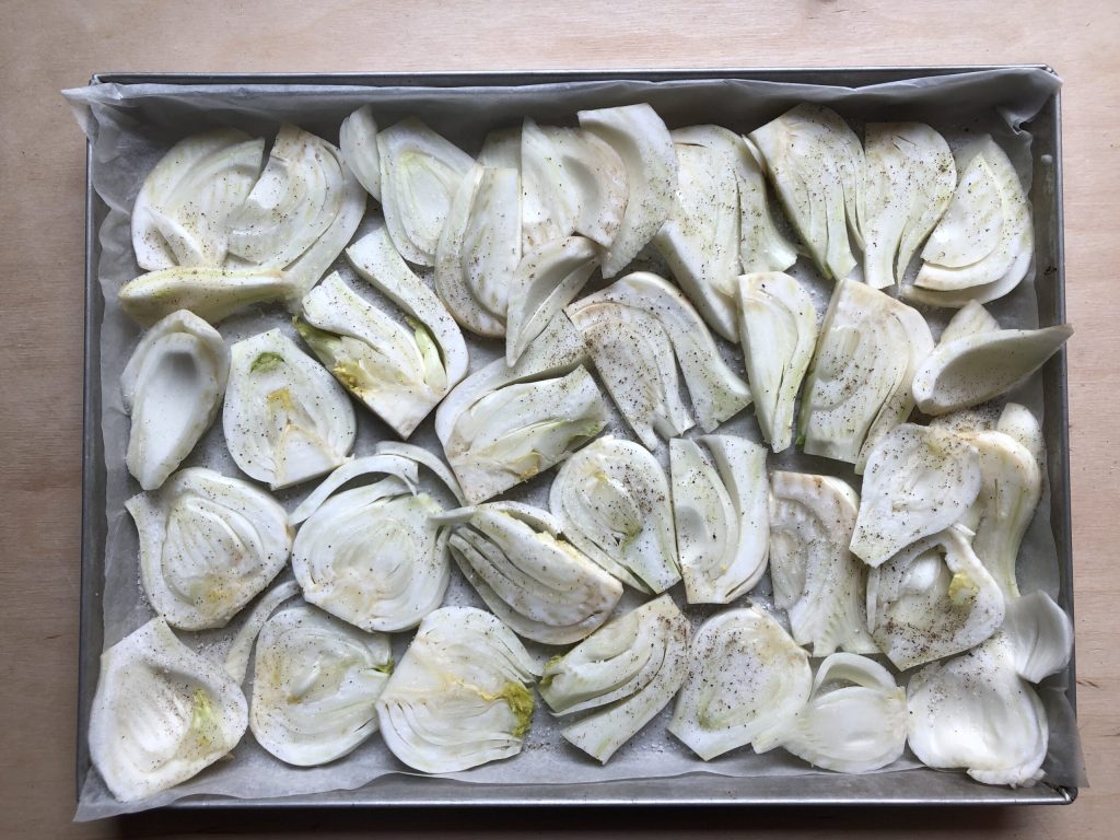 Espalhe esta mistura uniformemente sobre o funcho. Por fim, regue tudo com um pouco de azeite.